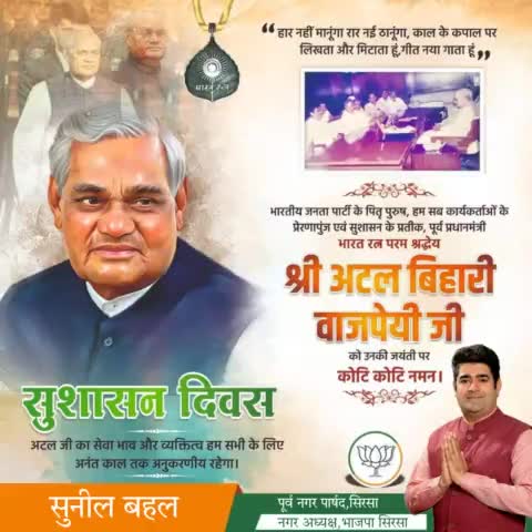 भारतीय जनता पार्टी के पितृ पुरुष, हम सब कार्यकर्ताओं के प्रेरणापुंज और सुशासन के प्रतीक पूर्व प्रधानमंत्री भारत रत्न परम श्रद्धेय श्री अटल बिहारी वाजपेयी जी को उनकी जयंती पर कोटि-कोटि नमन।