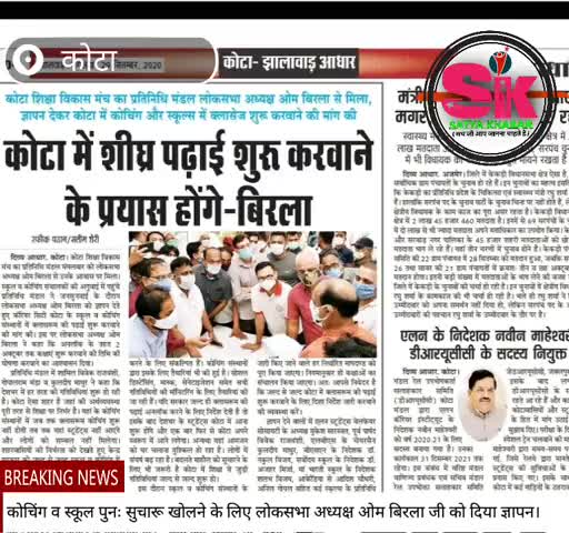 लाडपुरा: कोटा लोकसभा अध्यक्ष ओम बिरला को दिया ज्ञापन 2 अक्टूबर,2020 ऑनलाइन से साथ कक्षाएं शुरू करने का दिया आसवन।