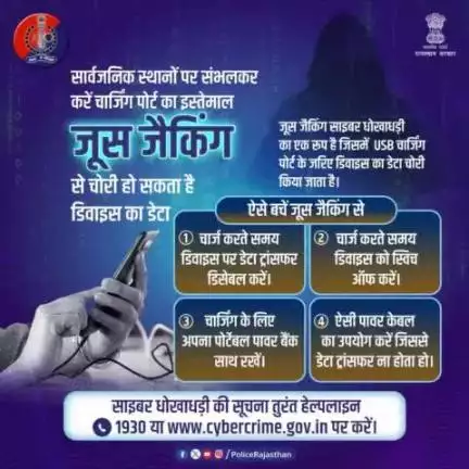 *@18churu ——सार्वजनिक स्थानों पर डिवाइस चार्जिंग के दौरान हो सकता है डेटा चोरी। जूस जैकिंग के नाम से जानी जाने वाली इस धोखाधड़ी में चार्जिंग पोर्ट डेटा कनेक्शन के लिए भी इस्तेमाल हो सकता है जबकि पीड़ित को लगता है कि वह केवल चार्जिंग