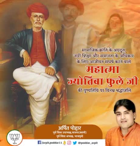 सामाजिक क्रांति के अग्रदूत, नारी शिक्षा और समानता के अधिकार के लिए आजीवन संघर्ष करने वाले महात्मा ज्योतिबा फुले जी की पुण्यतिथि पर विनम्र श्रद्धांजलि🙏 #MahatmaJyotiraoPhule