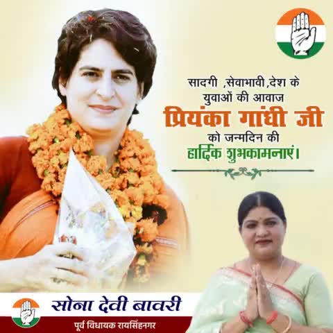 महिला सशक्तिकरण की प्रतिमूर्ति एवं अखिल भारतीय कांग्रेस कमेटी की महासचिव श्रीमती प्रियंका गांधी वाड्रा जी को जन्मदिन की हार्दिक बधाई एवं शुभकामनाएं। मैं ईश्वर से आपके स्वस्थ, सुदीर्घ एवं यशस्वी जीवन की कामना करती हूं। Priyanka Gandhi Vadra