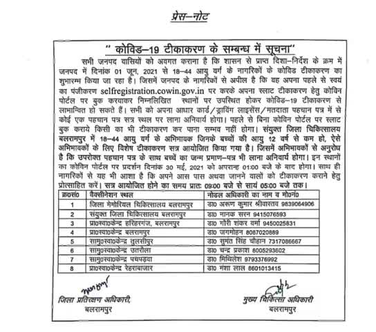 बलरामपुर में 18-44 आयु वर्ग के नागरिकों का टीकाकरण प्रारंभ किया जा रहा है अपना अपना रजिस्ट्रेशन करें और सेंटर पर पहुंचे