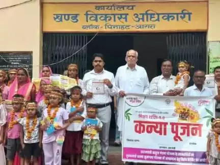 पिनाहट में मंगलवार दोपहर 3 बजे नवरात्रि की अष्टमी पर विकास खंड पिनाहट कार्यालय सभागार में कन्या पूजन कार्यक्रम का आयोजन किया गया। ब्लॉक प्रमुख सत्यवीर सिंह भदौरिया सहित अधिकारियों ने नौ कन्याओं के चरण धोकर पूजन किया और उन्हें भोजन व उपहार भेंट किए। इस अवसर पर ब्लॉक प्रमुख ने कहा कि कन्या पूजन बेटियों के सम्मान और शक्ति स्वरूप की उपासना का प्रतीक है।