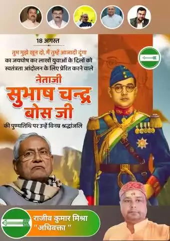 आजाद हिंद फ़ौज के संस्थापक, भारतीय स्वतंत्रता संग्राम के महानायक नेताजी सुभाष चंद्र बोस जी की पुण्यतिथि पर जदयू शिक्षा प्रकोष्ठ समस्तीपुर की ओर से उन्हें कोटिशः नमन। 🙏🙏
