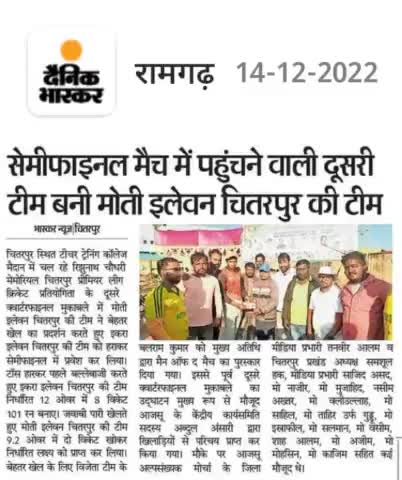 आज दिनाँक 13 दिसंबर 2022 को RNC मेमोरियल क्रिकेट टूर्नामेंट के क्वार्टरफाइनल मैच के दूसरे मैच की विजेता बनी मोती इलेवन की टीम! विजेता टीम के बलराम कुमार को मैन ऑफ द मैच का खिताब आजसू पार्टी के केंद्रीय सदस्य अब्दुल अंसारी के द्वारा दिया गया