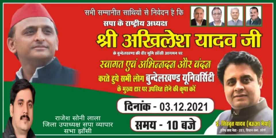 माननीय राष्ट्रीय अध्यक्ष अखिलेश यादव जी का स्वागत सिंहव्रत यादव बबुआ भैया के द्वारा 3 तारीख और सुबह 10:00 बजे बुंदेलखंड यूनिवर्सिटी गेट पर किया जा रहा है