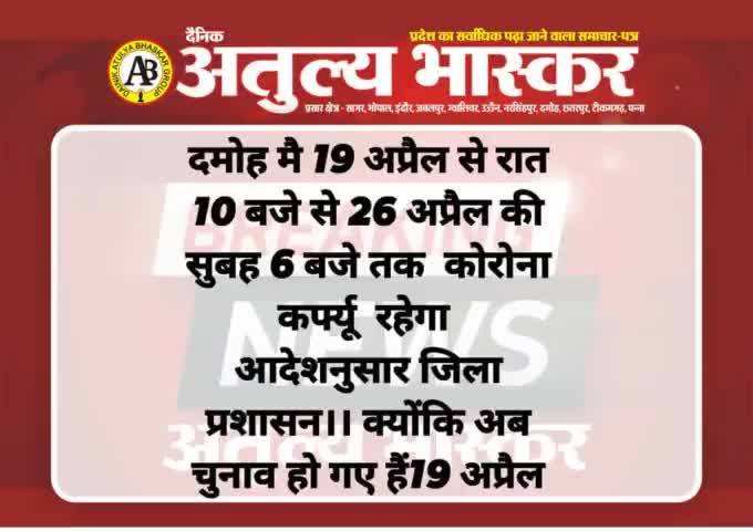 दमोह में 19 अप्रैल से रात10 बजे 26 अप्रैल की सुबह 6बजे तक कोरोना कर्फ्यू रहेगा @#