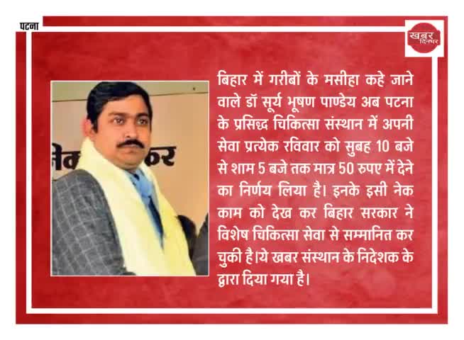 बिहार के लोगों के लिए मसीहा कहे जाने वाले डॉ सूर्य भूषण पाण्डेय को मिला विशेष चिकित्सा सेवा सम्मान।