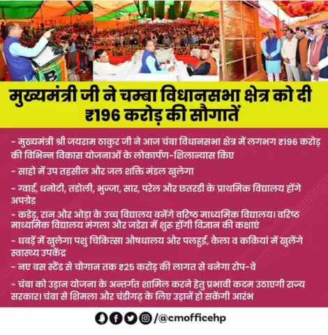 माननीय मुख्यमंत्री श्री जय राम ठाकुर जी ने चम्बा विधानसभा क्षेत्र को करीब 196 करोड़ की विकास योजनाओं के शिलान्यास किए।। " सबका साथ, सबका विकास, सबका विश्वास, सबका प्रयास’’ ही हमारा लक्ष्य है।