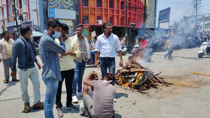 पेट्रोल-डीजल एवं रसोई गैस की बढ़ती कीमतों के कारण शहर कांग्रेस द्वारा मोटरसाइकिल का अंतिम संस्कार कर विरोध प्रदर्शन