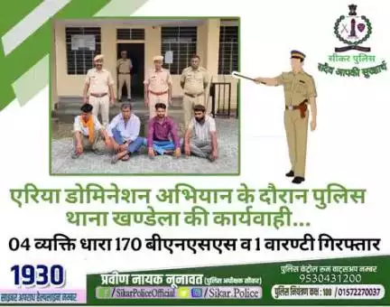 #सीकर 🔸एरिया डोमिनेशन अभियान के दौरान पुलिस थाना खण्डेला की कार्यवाही... ▪️04 व्यक्ति धारा 170 बीएनएसएस व 1 वारण्टी गिरफ्तार #थाना_खंडेला #TeamSikarPolice