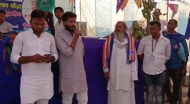 अजीतमल: बौद्ध कथा में पहुंचे जिला पंचायत अध्यक्ष कमल दोहरे सम्बोधित करते हुए