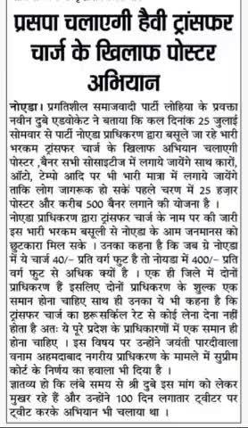 नोएडा में लागू ट्रांसफर चार्ज के खिलाफ प्रसपा चलाएगी पोस्टर ,बैनर अभियान ।