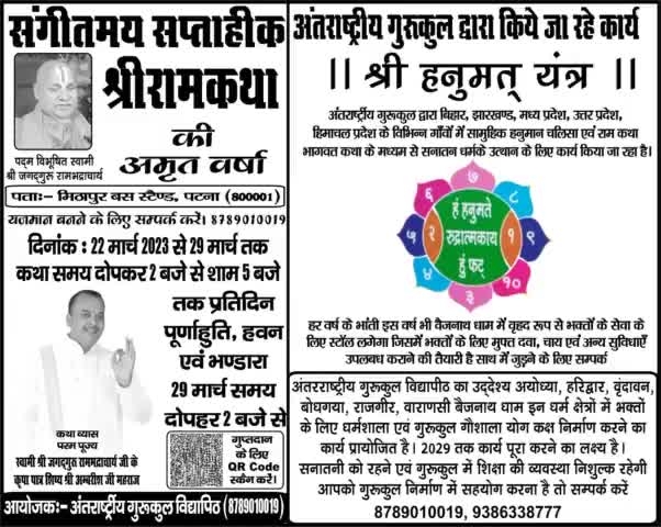 पटना मिठापुर बस स्टैंड में जगद्गुरु रामभद्राचार्य जी के शिष्य श्री अम्बरीष जी महाराज द्वारा प्रवचन के साथ भंडारा का आयोजन 22 मार्च से 29 मार्च तक
