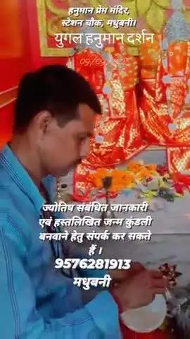 हनुमान प्रेम मंदिर, स्टेशन चौक, मधुबनी। ज्योतिष संबंधित जानकारी एवं हस्तलिखित जन्म कुंडली बनवाने हेतु संपर्क कर सकते हैं