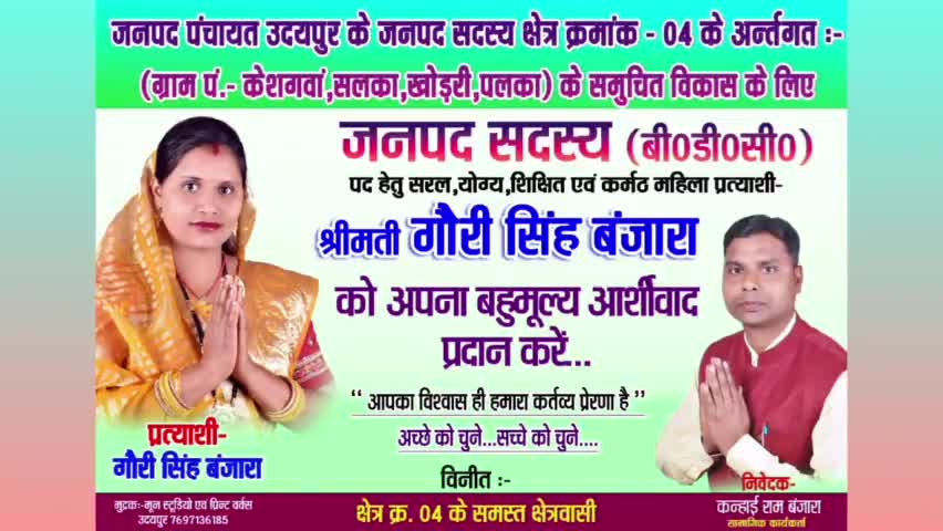 जनपद पंचायत उदयपुर के जनपद सदस्य क्षेत्र क्र. 04 से BDC प्रत्याशी-गौरी कन्हाई राम बंजारा हैं प्रबल दावेदार।