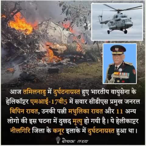 तमिलनाडु के कुन्नूर में भारतीय सेना के हेलिकॉप्टर का दुर्घटनाग्रस्त होना बेहद दुखद है. CDS बिपिन रावत जी और उनकी धर्मपत्नी समेत सेना के कई अधिकारी हेलिकॉप्टर में सवार थे. 14 में से 13 लोगों की मृत्यु का समाचार अत्यंत दु:खद है.😢🌸🙏✊