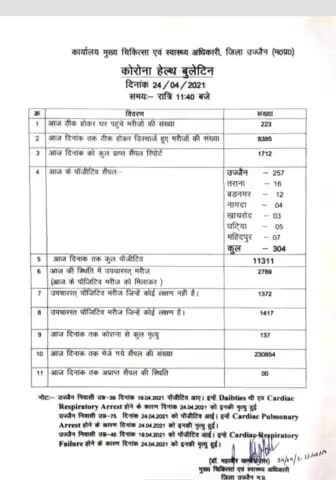 *कोरोना हेल्थ बुलेटिन जिला उज्जैन* *24-04-2021* रात्रि 11:40 *आज आई रिपोट में कुल 304 संक्रमित मिले है।*