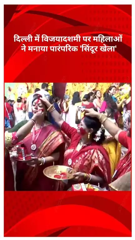 दिल्ली में विजयादशमी पर महिलाओं ने मनाया पारंपरिक 'सिंदूर खेला' दिल्ली में विजयादशमी के अवसर पर महिलाओं ने परंपरागत 'सिंदूर खेला' में हिस्सा लिया। इस दौरान महिलाओं ने एक-दूसरे को सिंदूर लगाकर सुख-समृद्धि और वैवाहिक जीवन की लंबी आयु की कामना की। दुर्गा पूजा पंडालों में आयोजित इस अनूठी परंपरा ने उत्सव के रंग को और भी जीवंत बना दिया।