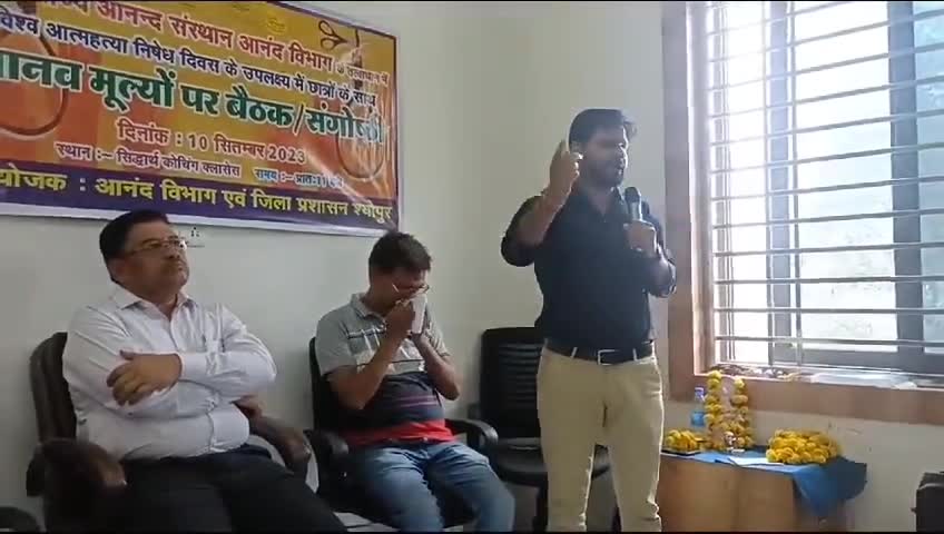 मध्यप्रदेश राज्य आनंद संस्थान के आनंद विभाग तत्वाधान में सिद्धार्थ कोचिंग क्लासेस पर छात्र-छात्राओं के समक्ष विश्व आत्महत्या दिवस के उपलक्ष में मानव मूल्यो पर पर संगोष्ठी का कार्यक्रम आयोजित किया गया जिसमें छात्रों के बीच अपने विचार रखें