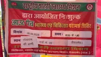 राष्ट्रीय शहरी स्वास्थ्य मिशन के अंतर्गत जैसलमेर के वार्ड संख्या 22, तोताराम की ढाणी में निशुल्क स्वास्थ्य शिविर का आयोजन किया गया। इस शिविर में आमजन को मुफ्त चिकित्सा परामर्श, उपचार और दवाइयां उपलब्ध करवाई गईं।