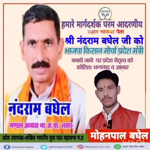 खबर :- लहार भाजपा नेता परम आदरणीय नंदराम बघेल जी भाजपा किसान मोर्चा के प्रदेश मंत्री बनाए गए बहुत बहुत बधाई हो
