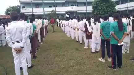 जन चेतना इंटर कॉलेज में असेंबली के दौरान बच्चों को साफ सफाई स्वच्छता पर निर्देश देते हैं प्रधानाचार्य राजकुमार पटेल