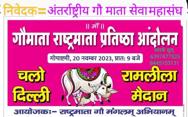 गौ माता को राष्ट्र माता का दर्जा दिलाने के लिए 20 नवंबर गोपाष्टमी वाले दिन प्रातः 9:00 बजे रामलीला ग्राउंड में