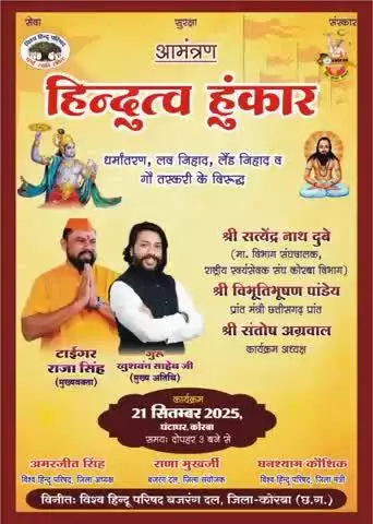 आज हिन्दुत्व हुंकार से गूंजेगा कोरबा: धर्मांतरण,लव जिहाद और गौ-तस्करी के खिलाफ उठेगी प्रचंड ललकार..