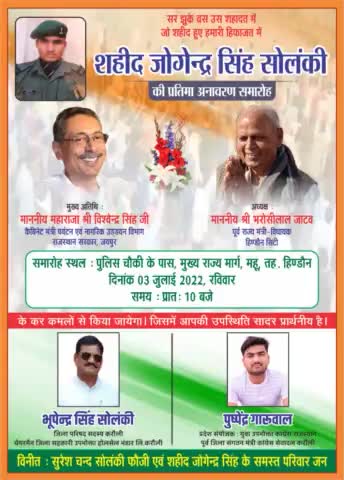 आज महू में शहीद जोगेंद्र सिंह सोलंकी जी की मूर्ति अनावरण समारोह में राजस्थान सरकार के कैबिनेट मंत्री माननीय श्री विश्वेंद्र सिंह जी एवं पूर्व मंत्री एवं हिंडौन विधायक माननीय श्री भरोसीलाल जाटव जी शिरकत करेंगे शहीद जोगेंद्रसिंह_सोलंकीअमर रहे