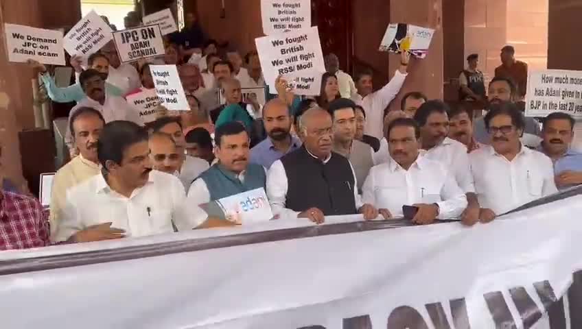 राज्यसभा में विपक्ष के नेता मलिकार्जुन खरगे के साथ विपक्ष के सांसदों का 'मोदी-शाही' के खिलाफ पार्लियामेंट हाउस से विजय चौक तक मार्च।
