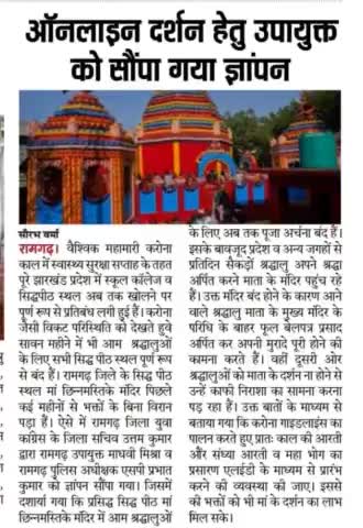 डीसी एवं एसपी से मांग रजरप्पा धाम मे ऑनलाइन पूजा की व्यवस्था की जाए एलसीडी के माध्यम से भक्तों को माता का दर्शन हो