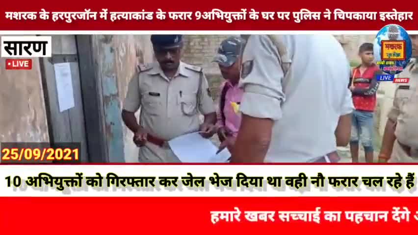मशरक: मशरक : के हरपुरजाॅन में हत्याकांड के फरार 9 अभियुक्तों के घर पर पुलिस ने चिपकाया इस्तेहार।