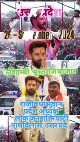 सम्मानित साथियों 26 सितंबर सन 2024 दिन बृहस्पतिवार समय 1:00 बजे मूरतगंज बाजार कौशांबी उत्तर प्रदेश में आगमन लोक जनशक्ति पार्टी रामविलास के राष्ट्रीय अध्यक्ष एवं केंद्रीय मंत्री भारत सरकार बनने के बाद प्रथम आगमन माननीय चिराग पासवान साहब जी देश के युवा हृदय सम्राट का प्रथम आगमन हो रहा है आप लोग भारी से भारी संख्या में पहुंचकर उनके विचारों को सुने और उनके हाथों को मजबूत करें लोक जनशक्ति पार्टी रामविलास को मजबूत करें निवेदक कार्यक्रम के आयोजक राजीव पासवान प्रदेश अध्यक्ष लोक जनशक्ति पार्टी रामविलास उत्तर प्रदेश