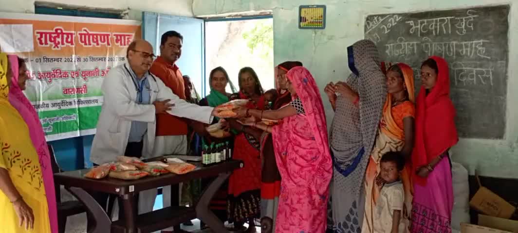 राष्ट्रीय पोषण माह के अन्तर्गत आज अपने यहां भटवारा खुर्द के आंगनबाड़ी सेन्टर पर पोषण वितरण करते हुए साथ में डा.दिनेश याद