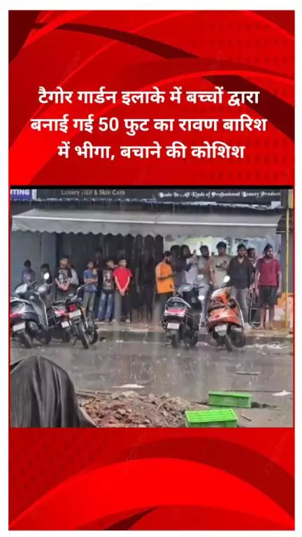 टैगोर गार्डन इलाके में बच्चों द्वारा बनाई गई 50 फुट का रावण बारिश में भीगा, बचाने की कोशिश जारी, तिरपाल ओढ़ाया गया