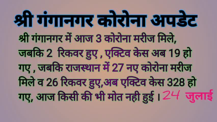#श्रीगंगानगर में आज 3 कोरोना मरीज मिले, जबकि 2 रिकवर हुए , एक्टिव केस अब 19 हो गए , जबकि राजस्थान में 27 नए कोरोना मरीज