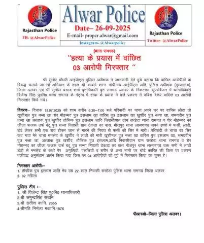 पुलिस अधीक्षक सुधीर चौधरी के निर्देशन में पुलिस थाना रामगढ़ मय टीम की कार्यवाही। हत्या के प्रयास में वांछित 03 आरोपी गिरफ्तार। @PoliceRajasthan @1stIndiaNewsRaj