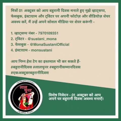 मित्रों 01 अक्टूबर को आप बहुरानी दिवस मनाते हुए अपनी फोटोज़ और वीडियोज़ शेयर कर करें, मैं उन्हें अपने सोशल मीडिया पर शेयर करूंगी - 1. व्हाट्सप्प नंबर - 7970109351 2. ट्विटर - @sustani_mona 3. फेसबुक - @MonaSustaniOfficial