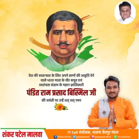 महान स्वतंत्रता सेनानी और राष्ट्रभक्त अमर शहीद रामप्रसाद बिस्मिल जी की जयंती पर कोटि-कोटि नमन एवं भावपूर्ण श्रद्धांजलि।