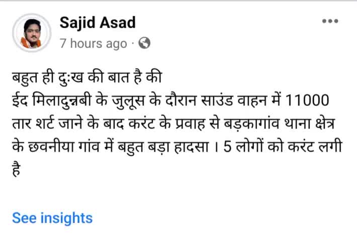 बहुत ही दुःख की बात है की ईद मिलादुन्नबी के जुलूस के दौरान साउंड वाहन में 11000 तार शर्ट जाने के बाद करंट के प्रवाह से बड़कागांव थाना क्षेत्र के छवनीया गांव में बहुत बड़ा हादसा । 5 लोगों को करंट लगी है