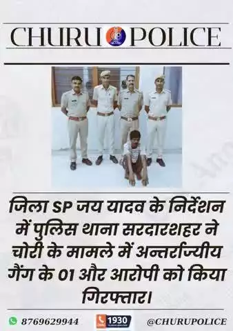 जिला SP जय यादव के निर्देशन में PSसरदारशहर ने चोरी के मामले में अन्तर्राज्यीय गैंग के 01 और आरोपी को किया गिरफ्तार।