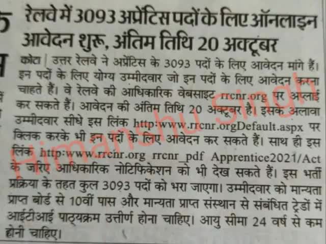 रेलवे ने अप्रेंटिस पदों के लिए आवेदन शुरू कर दिये है l