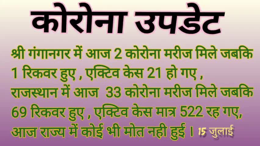 #श्रीगंगानगर में आज 2 कोरोना मरीज मिले जबकि 1 रिकवर हुए , एक्टिव केस 21 हो गए , राजस्थान में आज 33 कोरोना मरीज मिले