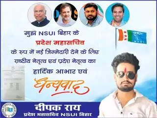 मुझे NSUI बिहार के प्रदेश महासचिव की जिम्मेदारी देने के लिए राष्ट्रीय नेतृत्व एवं प्रदेश नेतृत्व का आभार एवं धन्यवाद।