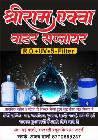 श्री राम एक्वा वॉटर सप्लायर कटनी नई बस्ती जगमोहन दास वार्ड पानी के डब्बे के हेतु संपर्क करें। +91 87706 89237 +91 93032 67398