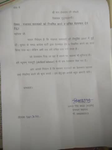 पंचायत सहायकों ने केबिनेट मंत्री हेमाराम चौधरी को विभिन्न मांगों को लेकर ज्ञापन सौंपा। वेतनमान बढ़ाने व स्थायीकरण की मा