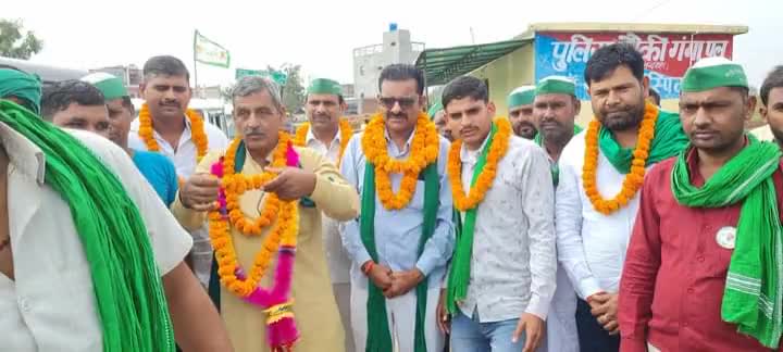 अनूपशहर: गंगा घाट पर भाकियू कार्यकर्ताओं ने दोनों पदाधिकारियों का फूल माला पहनाकर स्वागत किया