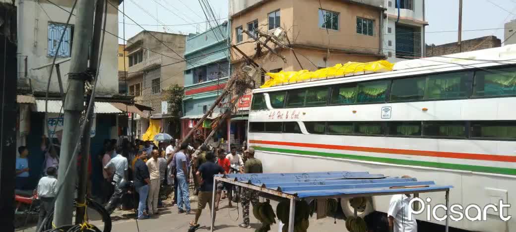 मधुबनी बिहार से आने वाली गाड़ी शहर के मकतपुर चौक बिजली खंभे को तोड़ते हुए फस गई जिसमें 80 से 90 संख्या बस में सवार .