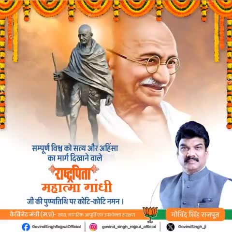 सत्य, अहिंसा और स्वच्छता हेतु प्रेरित करके विश्व को शान्ति का मार्ग दिखाने वाले, त्याग व तपस्या के प्रेरणास्त्रोत, त्याग एवं तपस्या की प्रतिमूर्ति, दुनिया को अहिंसा और स्वच्छता का पाठ पढ़ाने वाले राष्ट्रपिता महात्मा गांधी जी की पुण्यतिथि प